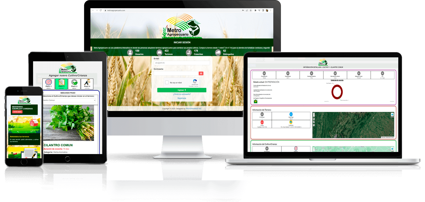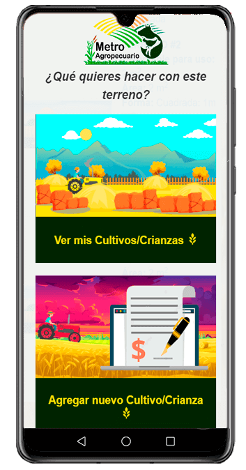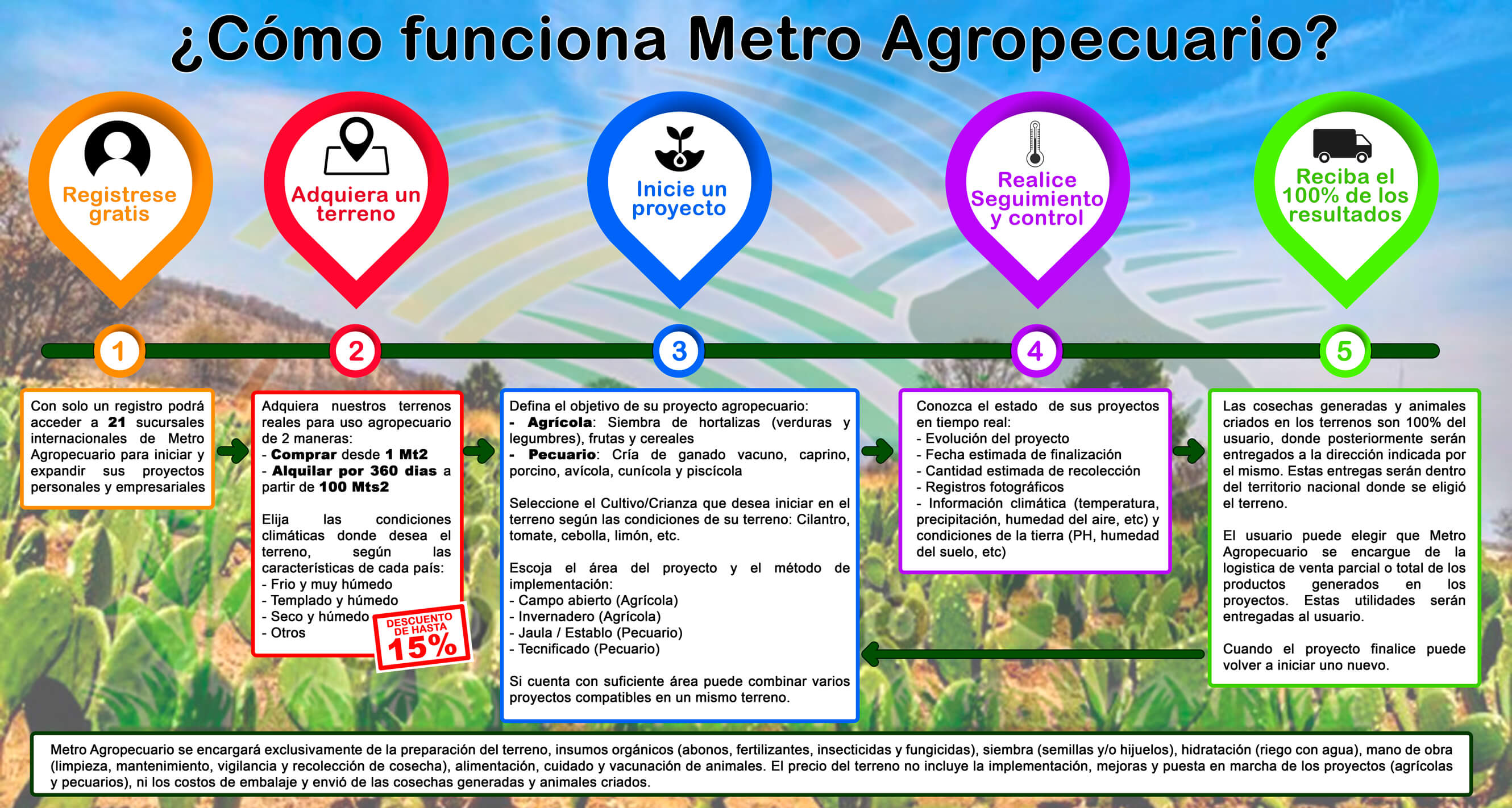 Metro Agropecuario es una plataforma interactiva en donde personas naturales y jurídicas adquieren nuestros terrenos para iniciar proyectos agropecuarios para consumo personal y/o oportunidad empresarial. Estos terrenos son operados exclusivamente por Metro Agropecuario para ofrecer control y calidad en los productos finales.